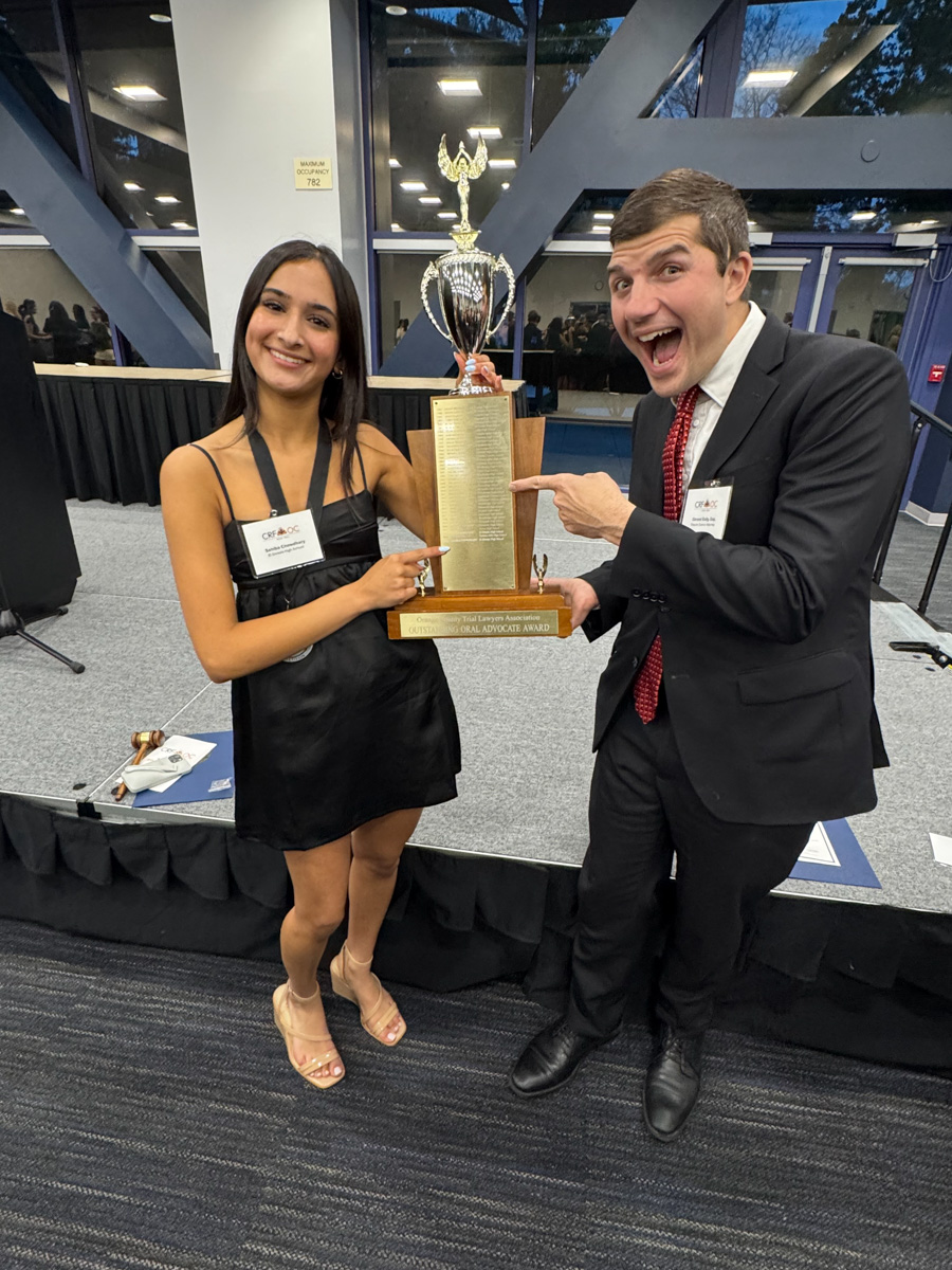 Three El Dorado students—Mia Demonte, JD Cavalluzzi, and Lauren Wilson—were each recognized as Outstanding Attorneys. This distinction is awarded to approximately 16 of the 288 student trial attorneys who participate in the competition, highlighting their exemplary advocacy and legal reasoning skills. In addition, Sahiba Chowdhary earned the title of Outstanding Pretrial Attorney, an honor granted to only about 12 of the 96 student pretrial attorneys for excellence in presenting pretrial motions and demonstrating deep understanding of constitutional issues.