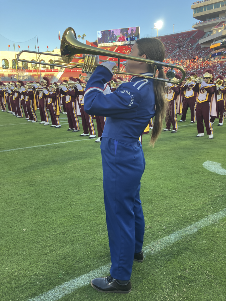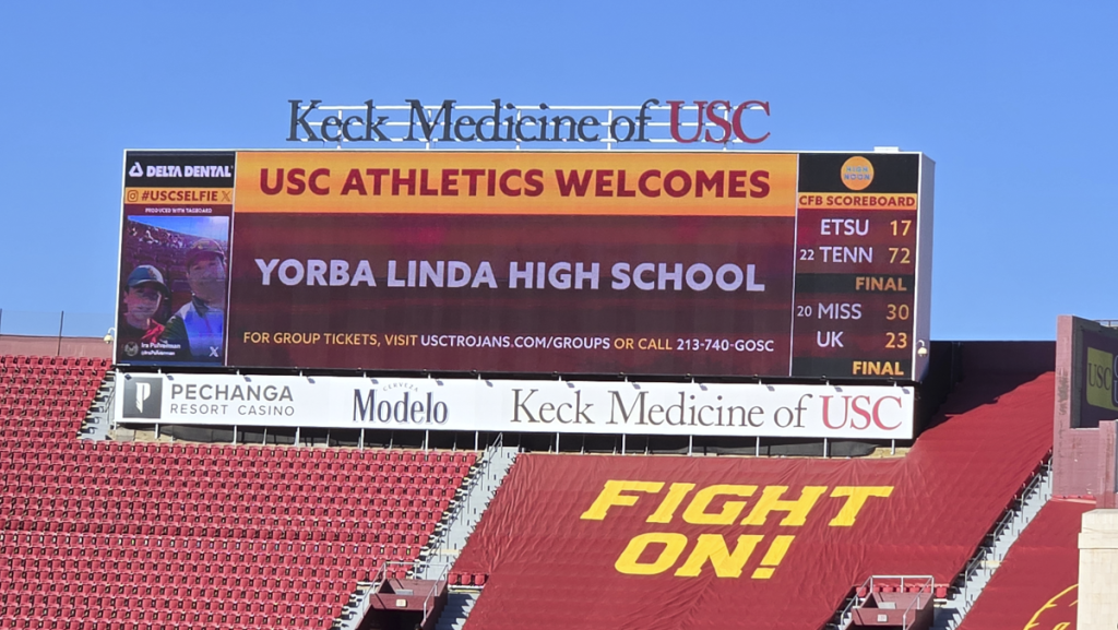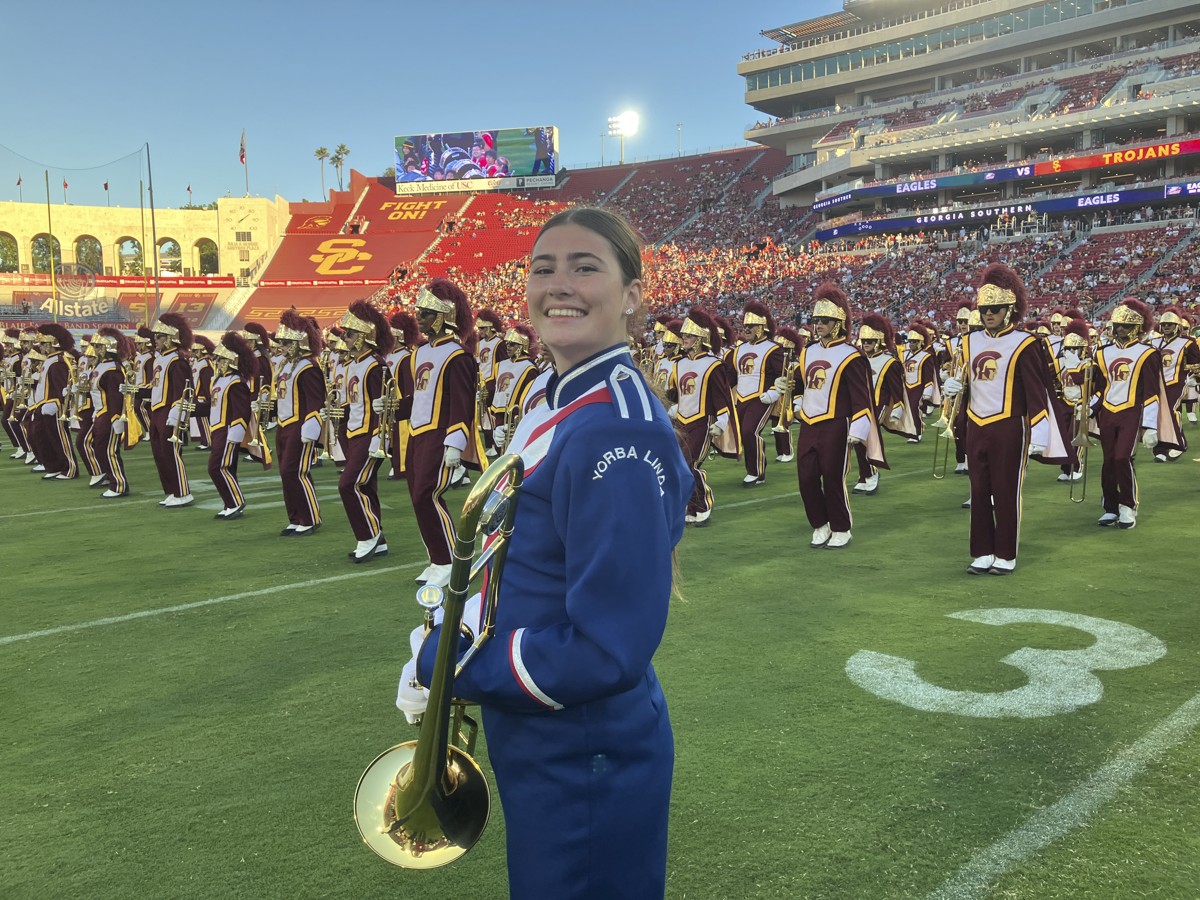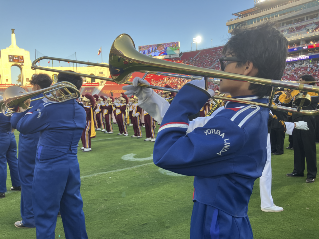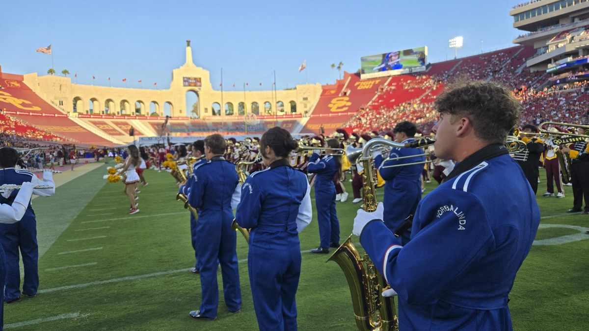 On Saturday, September 6, the Yorba Linda High School (YLHS) Mustang Band and Guard participated in a collaborative field performance the University of Southern California’s world-renowned Spirit of Troy Marching Band at the historic Coliseum. . The collaboration offered students a unique opportunity to experience collegiate-level musicianship while representing their high school on a prominent stage.