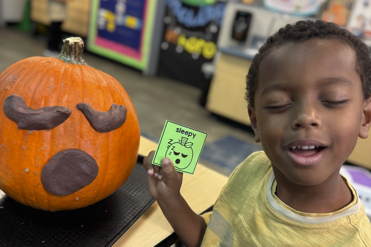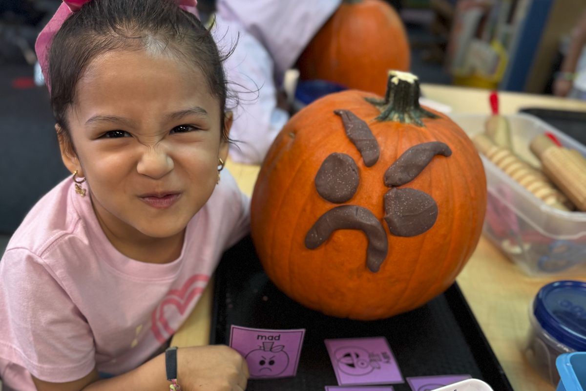 At Van Buren Elementary School, students in Mrs. Zunigabravo’s Transitional Kindergarten class began the month of October with engaging, hands-on activities centered around the themes of fall and the Halloween season. Using playdough, students explored emotional expression by designing a variety of faces on real pumpkins. This creative exercise not only encouraged imaginative play but also supported fine motor skill development and social-emotional learning as students identified and named emotions such as happiness, anger, excitement, tiredness, and surprise.