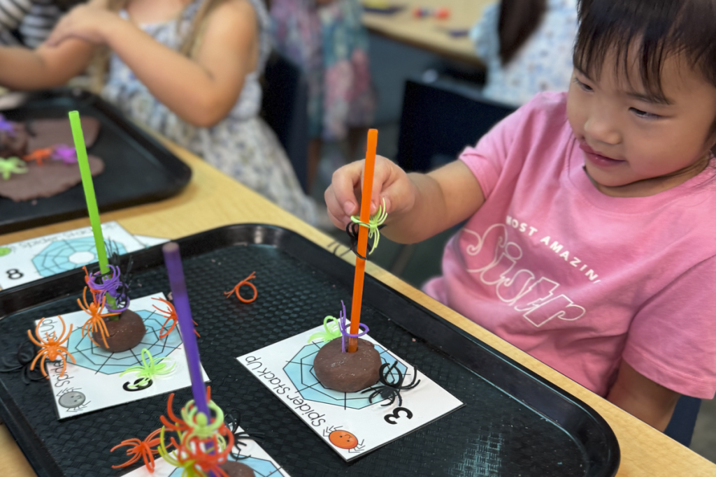 The learning continued as students participated in a themed math and coordination activity, stringing spider rings through straws to practice counting, number recognition, and hand-eye coordination. Through these seasonal activities, students strengthened essential early learning skills while celebrating the spirit of autumn in a fun and meaningful way.