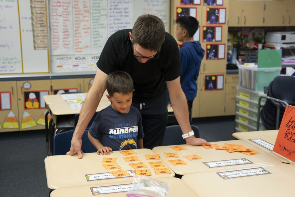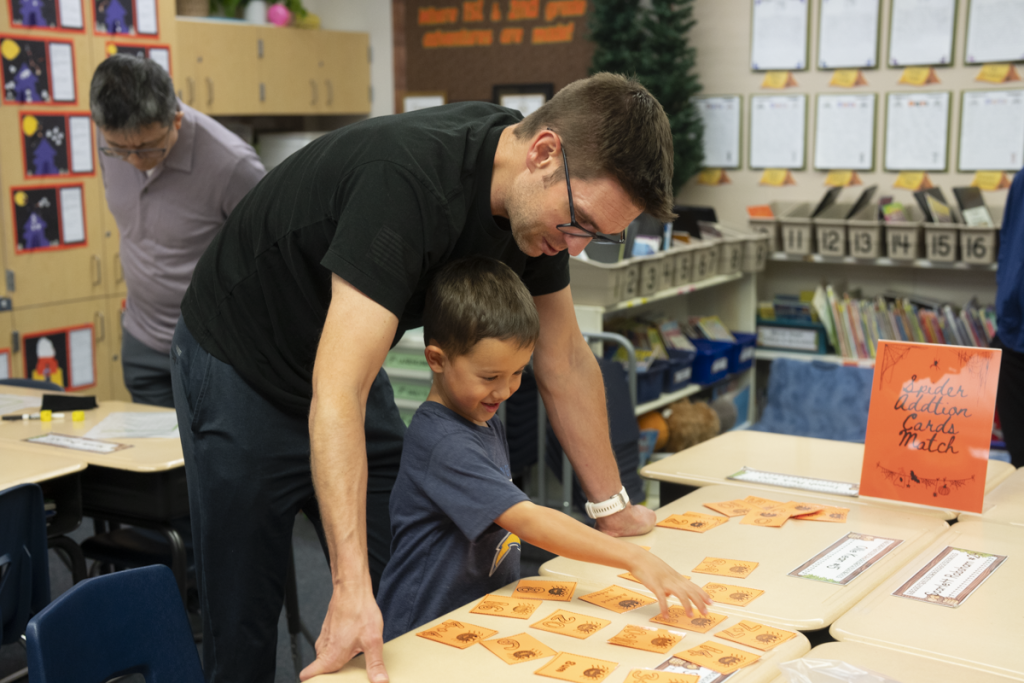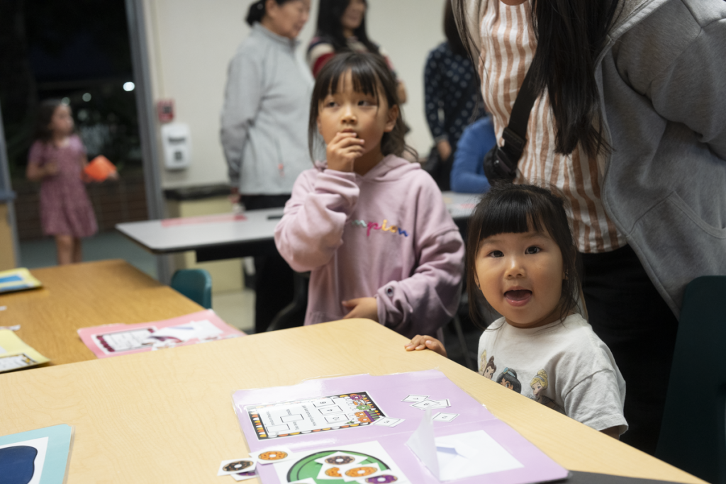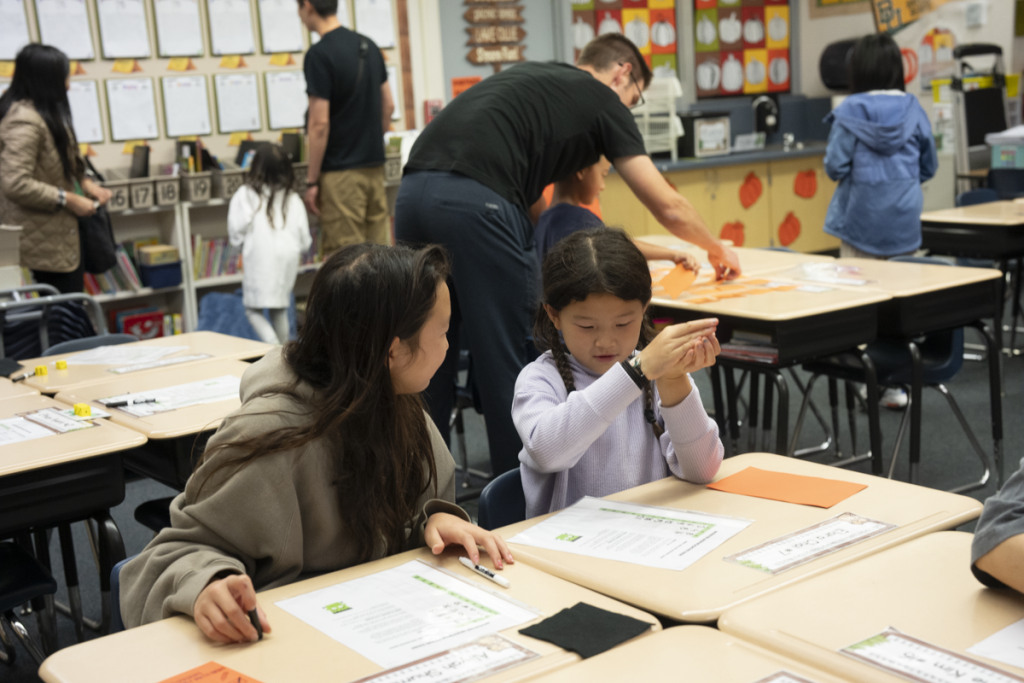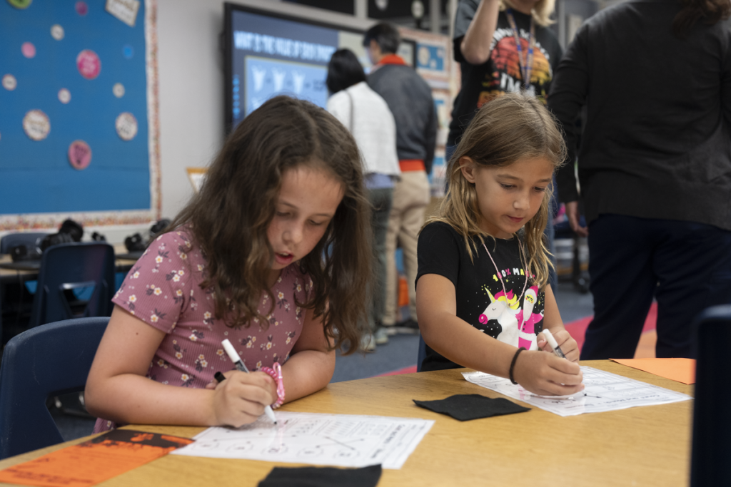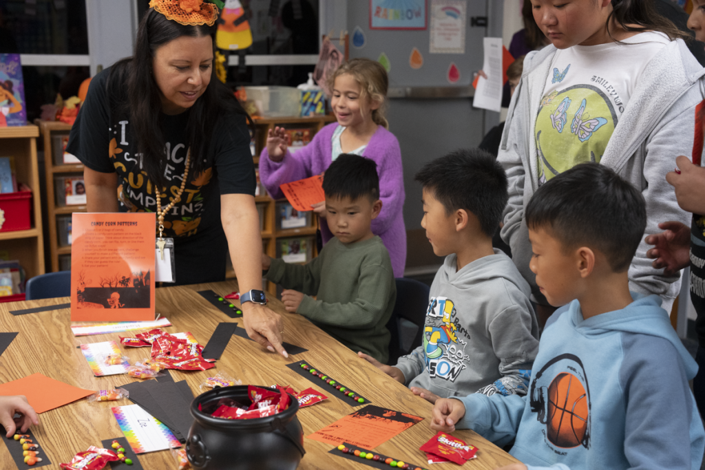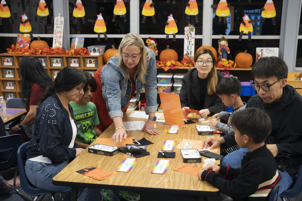 Throughout the evening, families collaborated on interactive challenges that included pumpkin patterns, spooky story problems, estimation games, and shape-building activities. Each classroom offered unique opportunities for students and their families to problem-solve, think critically, and apply mathematical concepts in creative ways. The festive theme and playful environment encouraged participation from learners of all ages and skill levels, while many activities were intentionally designed to be easily replicated at home to extend learning beyond the classroom.