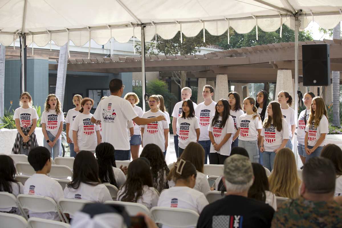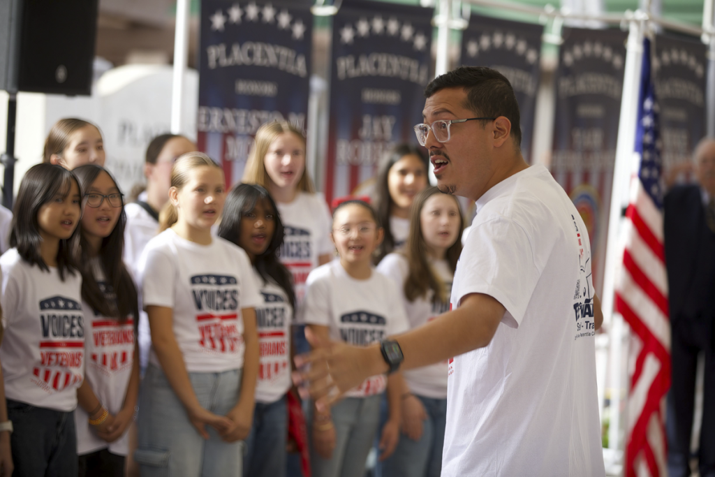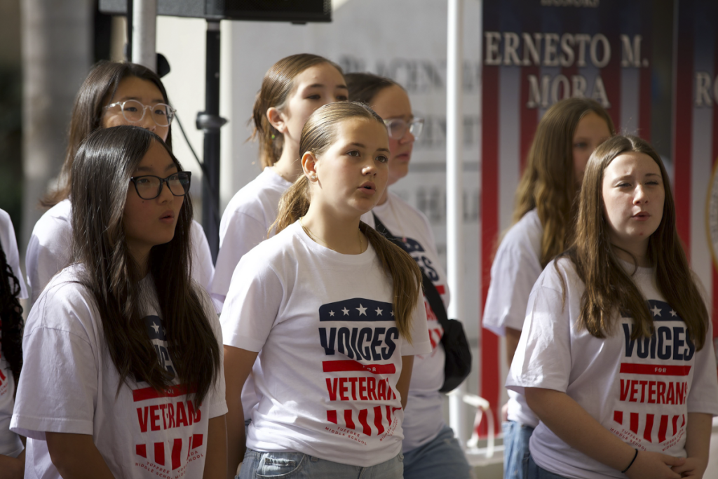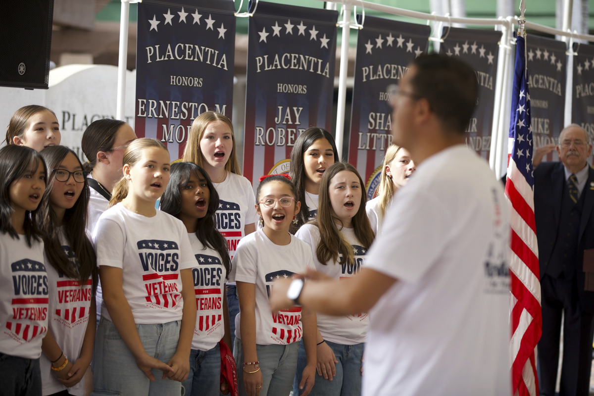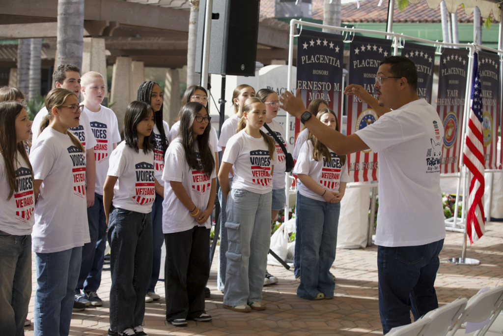 On Tuesday, November 11, choir students from Tuffree Middle School and Yorba Linda Middle School proudly represented their campuses by performing at the City of Placentia’s annual Veterans Day Ceremony. Under the skilled direction of music educators Mr. Marlon Santizo and Mr. Robert Seitz, students presented a series of musical selections, including a respectful and heartfelt performance of the National Anthem.