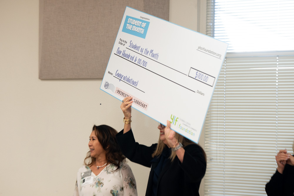 As part of the Foundation’s Student of the Month Program, Farida received a $100 scholarship presented by Foundation President Anthony Johnson, Treasurer Kevin McCobb, Board Member Lynn Campbell, and Executive Director Susan Wan-Ross. Each month, the program honors an outstanding local high school student who exemplifies academic excellence, leadership, and a strong commitment to community service.