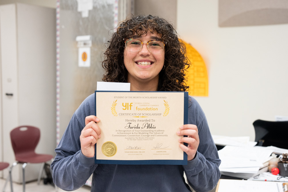 On Wednesday, January 14, the Yorba Linda Chamber of Commerce Foundation recognized Esperanza High School senior Farida Abbis as its November Student of the Month during a special surprise presentation on campus.