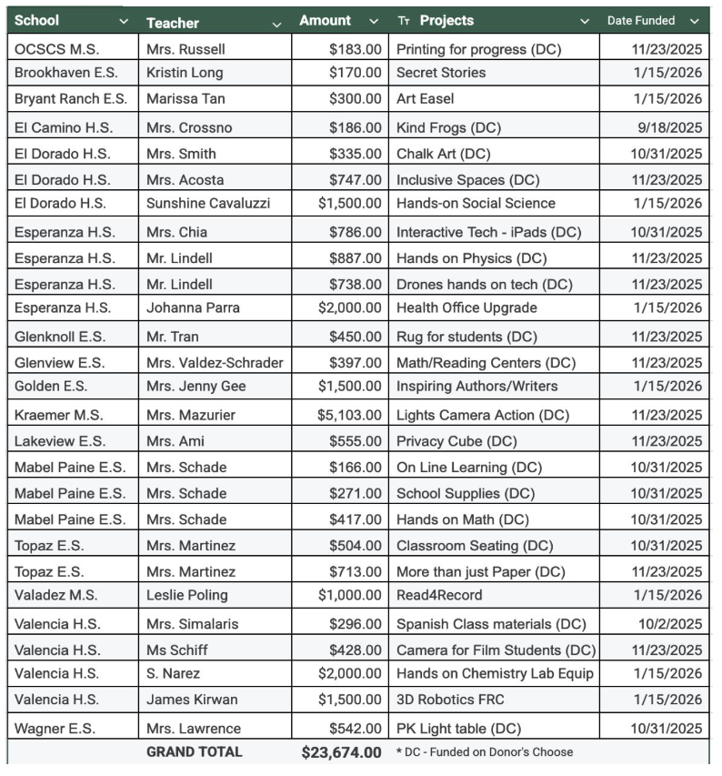 By investing in these educator-driven projects, the Foundation reinforces its mission to engage, enrich, and inspire student growth while supporting long-term academic achievement and career readiness across the district.